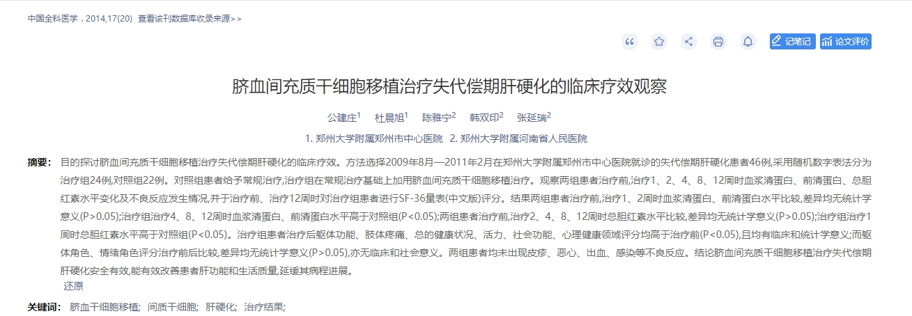 2014年,中國全科醫學(xué)在中國知網(wǎng)發(fā)表了一篇臍血間充質(zhì)干細胞移植治療失代償期肝硬化的臨床療效觀(guān)察的論文[2]。