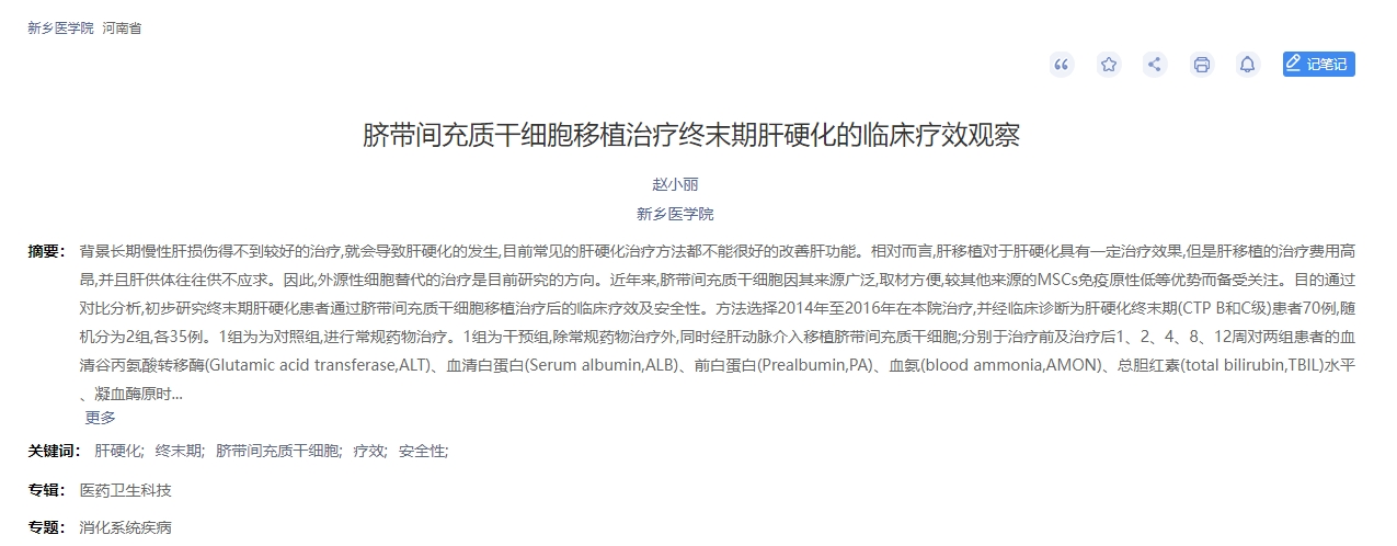 2019年,中國知網(wǎng)在刊發(fā)了一篇新鄉醫學(xué)院進(jìn)行了一項臍帶間充質(zhì)干細胞移植治療終末期肝硬化的臨床療效觀(guān)察的論文[7]。