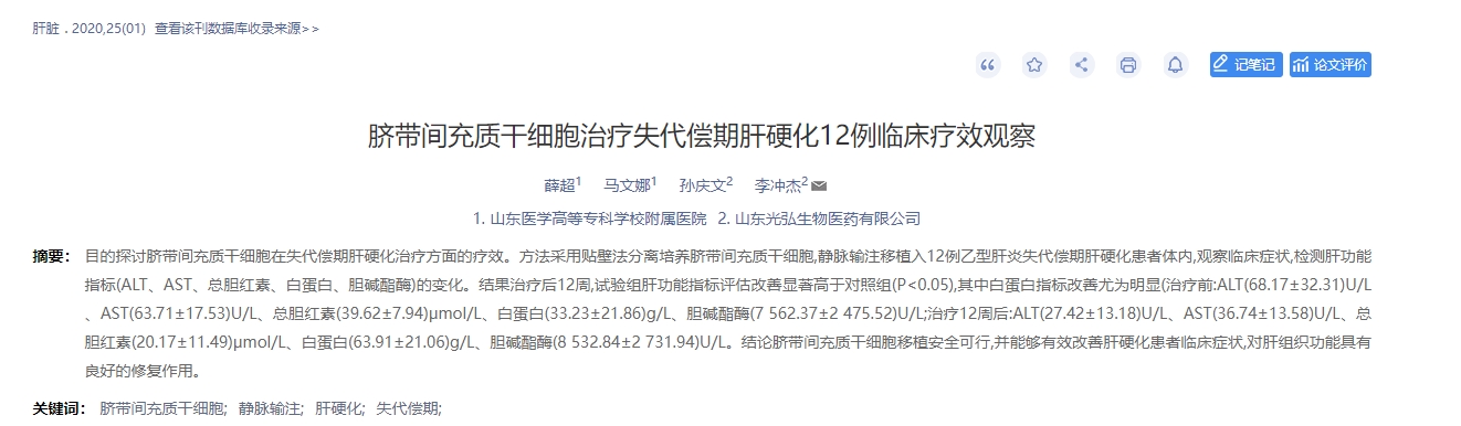 2020年,中國肝臟雜志刊發(fā)了一篇臍帶間充質(zhì)干細胞治療失代償期肝硬化12例臨床療效觀(guān)察的文章[8]。