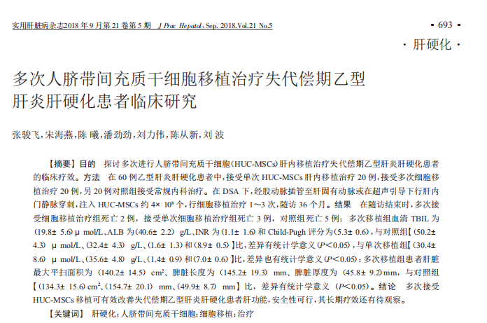 2017年,實(shí)用肝臟病雜志刊發(fā)了一篇人臍帶血干細胞治療失代償期酒精性肝硬化臨床觀(guān)察的文章[5]。
