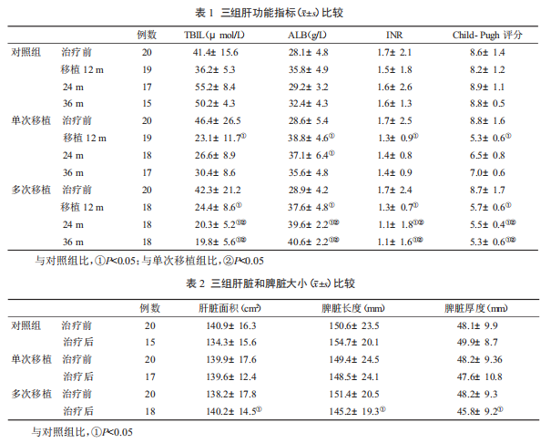 在60例乙型肝炎肝硬化患者中,接受單次HUC-MSCs肝內移植治療2例,接受多次細胞移植治療20例,另20例對照組接受常規內科治療。在隨訪(fǎng)12個(gè)月和24個(gè)月后,三組肝功能指標變化的比較:?jiǎn)未我浦步M血清ALB水平顯著(zhù)高于對照組;在隨訪(fǎng)36個(gè)月結束時(shí),多次移植組血清TBIL、ALB、INR和Child-Pugh評分與單次移植組和對照組相比,均有顯著(zhù)統計學(xué)差異;在隨訪(fǎng)36個(gè)月結束時(shí),多次接受細胞移植患者肝臟最大平掃面積較對照組顯著(zhù)增大,脾臟長(cháng)度和厚度較對照組顯著(zhù)縮小。
