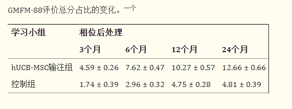 結論:治療后3、6、12、24個(gè)月,hUCB-MSC輸注組GMFM-88總比例和CFA總分變化均顯著(zhù)高于對照組。在基線(xiàn)腦電圖背景節律減慢的患者中,hUCB-MSC輸注后注意到彌漫性慢波較少。在常規 MRI 檢查的基礎上,治療后大腦結構的改善很少見(jiàn)。