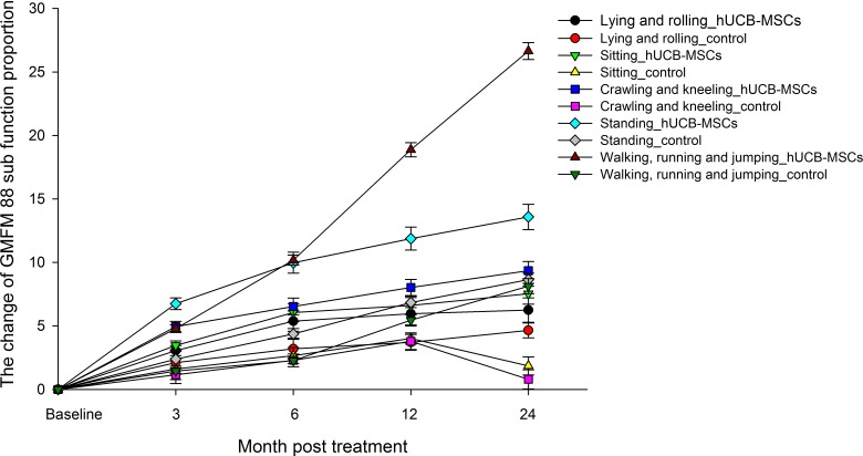 關(guān)于GMFM-88分數的每個(gè)功能的比例,基線(xiàn)水平的變化設置為零。在輸注hUCB-MSC后3個(gè)月,所有5個(gè)功能區域的GMFM-88評分呈上升趨勢(圖2)。治療后24個(gè)月,對照組的坐、爬和跪功能沒(méi)有顯著(zhù)改善,但其他區域的比例變化有所增加(圖2)。