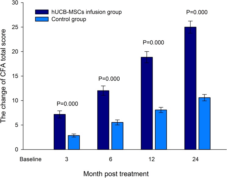 基線(xiàn)水平的CFA總分在hUCB-MSC輸注組中為66.04±1.48,在對照組中為65.70±1.37。組間未觀(guān)察到顯著(zhù)差異。CFA總分變化評估(表3)。