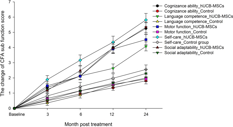 一致地,與對照組相比,hUCB-MSC輸注組中各項功能的CFA評分變化顯著(zhù)升高(圖4)。分數變化的基線(xiàn)水平設置為零。在hUCB-MSC輸注后3個(gè)月,所有5個(gè)功能區域的CFA評分均有改善的趨勢(圖4). 僅在治療后 24個(gè)月,對照組的評分變化有所改善(圖4)。