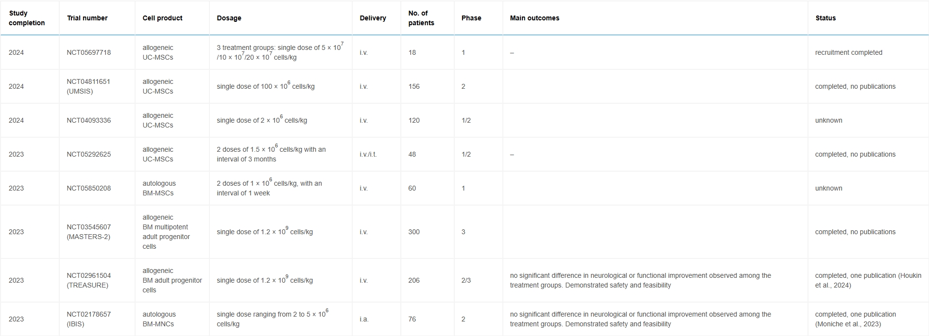 迄今為止,僅在2024年期間開(kāi)展過(guò)一項Ⅱ/Ⅲ期試驗——TREASURE研究,該研究評估了靜脈注射骨髓源性多潛能成體祖細胞對缺血性卒中患者的療效。