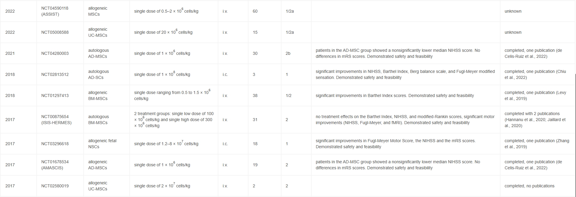 表1:干細胞治療成人缺血性中風(fēng)的部分臨床試驗摘要(2017年至今)