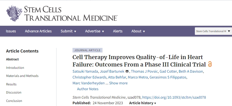參考資料:Satsuki Yamada, Jozef Bartunek, Thomas J Povsic, Gad Cotter, Beth A Davison, Christopher Edwards, Atta Behfar, Marco Metra, Gerasimos S Filippatos, Marc Vanderheyden, William Wijns, Andre Terzic, Cell Therapy Improves Quality-of-Life in Heart Failure: Outcomes From a Phase III Clinical Trial, Stem Cells Translational Medicine, 2023;, szad078, https://doi.org/10.1093/stcltm/szad078