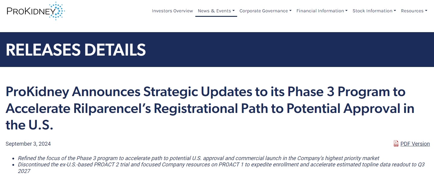 參考資料:1. ProKidney announces strategic updates to its phase 3 program to accelerate rilparencel’s registrational path to potential approval in the U.S. News release. ProKidney Corp. September 3, 2024. Accessed September 12, 2024. https://investors.prokidney.com/news-releases/news-release-details/prokidney-announces-strategic-updates-its-phase-3-program