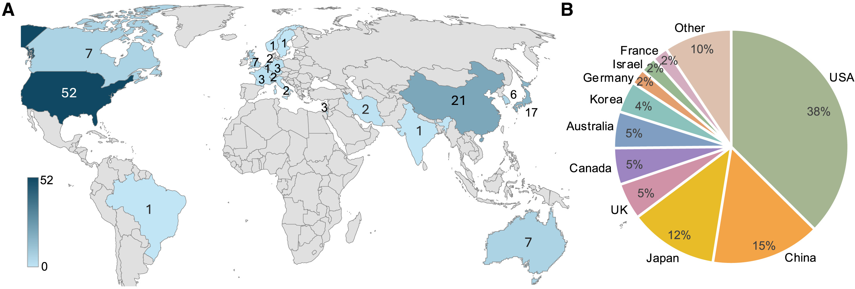 (A) 每個(gè)國家 hPSC 臨床試驗數量概覽。數字表示參與試驗的國家作為試驗地點(diǎn),因此在不同國家有多個(gè)地點(diǎn)的試驗將在地圖上被計算多次。在同一國家有多個(gè)地點(diǎn)的試驗僅算作一次試驗。圖表由Excel、Bing地圖制作。