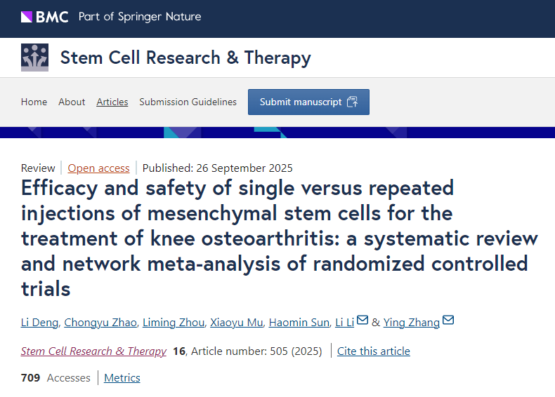 [12]Deng, L., Zhao, C., Zhou, L. et al. Efficacy and safety of single versus repeated injections of mesenchymal stem cells for the treatment of knee osteoarthritis: a systematic review and network meta-analysis of randomized controlled trials. Stem Cell Res Ther 16, 505 (2025). https://doi.org/10.1186/s13287-025-04638-2