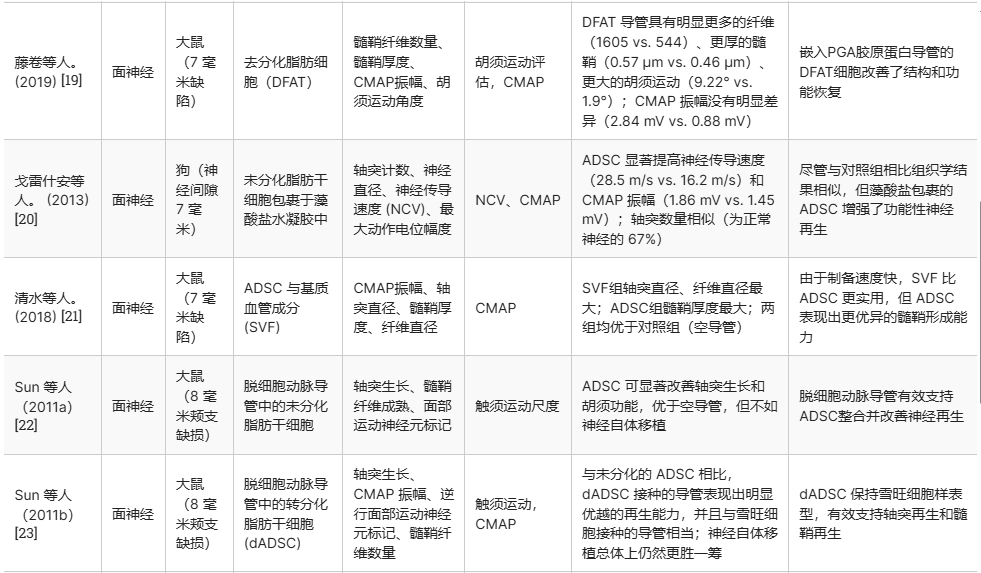 局限性與未來(lái)方向:本綜述的主要局限在于納入的研究絕大多數(除一項外)都是在動(dòng)物模型中評估ADSC/dADSC對周?chē)窠?jīng)再生的效果。
