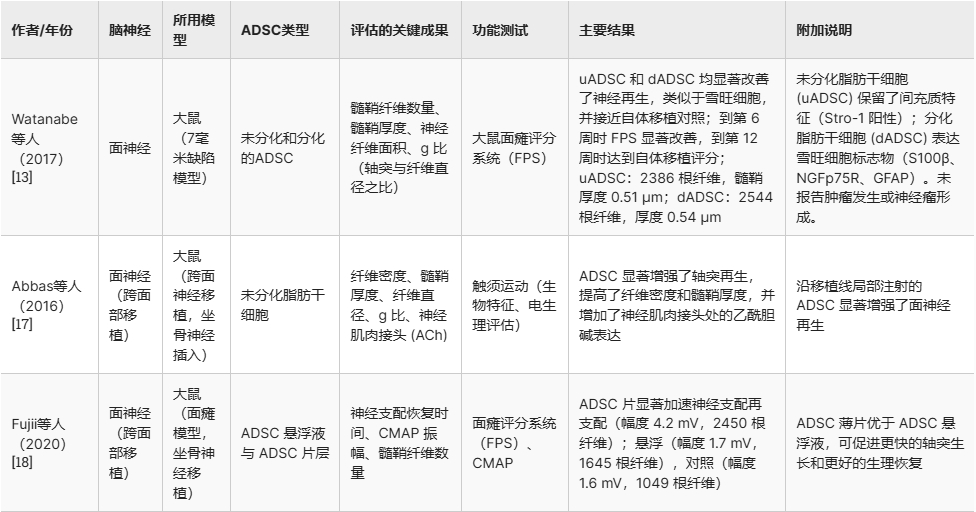 通過(guò)分析12篇相關(guān)研究(盡管主要為動(dòng)物實(shí)驗),發(fā)現無(wú)論是ADSC還是dADSC治療,均顯示出改善神經(jīng)再生、促進(jìn)髓鞘形成、恢復肌肉神經(jīng)支配以及增強腦神經(jīng)功能的潛力。這些初步結果表明,ADSC在腦神經(jīng)損傷修復中可能扮演著(zhù)重要角色。