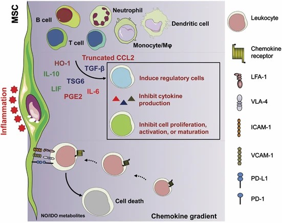 間充質(zhì)干細胞的免疫抑制特性。受損組織總是伴隨著(zhù)免疫細胞和間充質(zhì)干細胞的浸潤。炎癥會(huì )觸發(fā)間充質(zhì)干細胞中產(chǎn)生高水平的趨化因子和粘附分子,包括 CXCR3 配體、CCR5 配體、ICAM-1 和 VCAM-1。