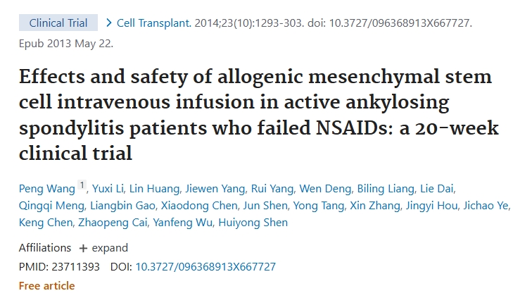 同種異體間充質(zhì)干細胞靜脈輸注對非甾體抗炎藥治療失敗的活動(dòng)性強直性脊柱炎患者的療效和安全性:一項為期20周的臨床試驗