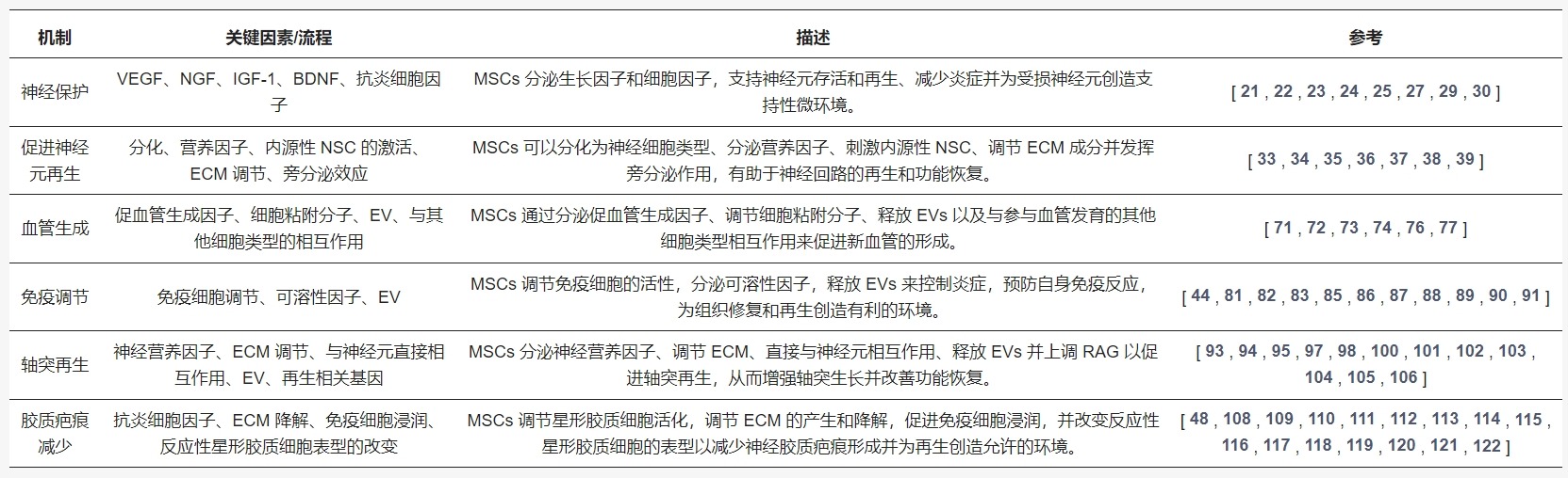 這篇綜述了目前間充質(zhì)干細胞治療脊髓損傷的作用機制。討論的關(guān)鍵機制包括通過(guò)分泌生長(cháng)因子和細胞因子進(jìn)行神經(jīng)保護,通過(guò)MSC分化為神經(jīng)細胞類(lèi)型促進(jìn)神經(jīng)元再生,通過(guò)釋放促血管生成因子進(jìn)行血管生成,通過(guò)調節免疫細胞活性進(jìn)行免疫調節,神經(jīng)營(yíng)養因子驅動(dòng)軸突再生,以及通過(guò)調節細胞外基質(zhì)成分減少神經(jīng)膠質(zhì)瘢痕。