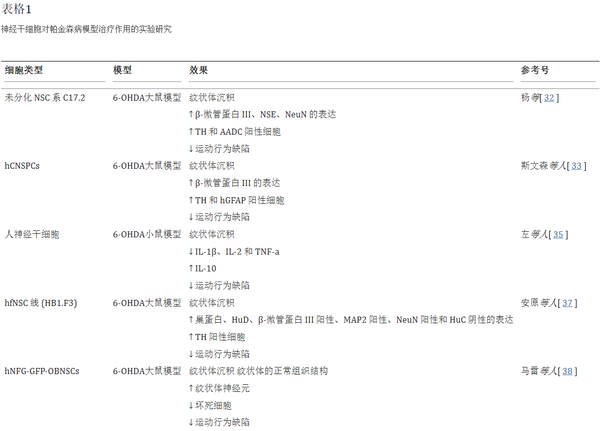 多項臨床前研究表明,不同類(lèi)型的人類(lèi)神經(jīng)干細胞移植后,可以在特定的大腦部位遷移、存活和增殖。免疫組織化學(xué)檢查支持的證據表明,移植的人類(lèi)神經(jīng)干細胞可以轉化為功能性神經(jīng)元并整合到神經(jīng)回路中。體內研究已證明神經(jīng)干細胞移植是治療帕金森病的有效方法(表格1)。