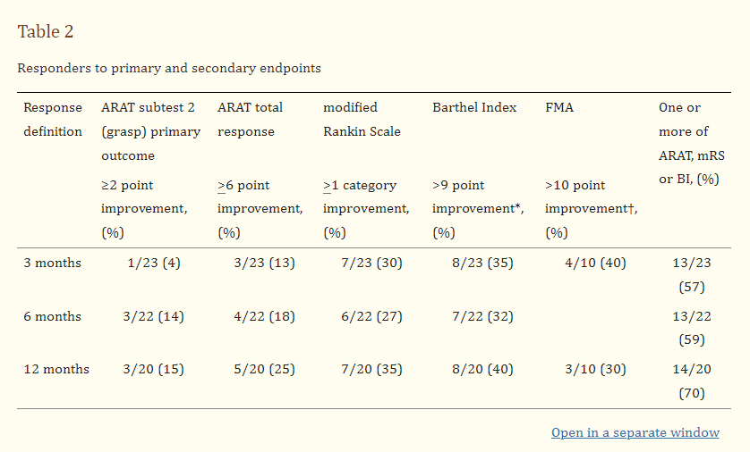 次要結果:7/23名患者在最后一次觀(guān)察時(shí)總ARAT評分有所改善,個(gè)體改善范圍在1到54分之間。五名 (22%) 患者達到改善≥6分的反應標準。沒(méi)有參與者表現出統計分析計劃中定義的 NIHSS總分發(fā)生10分或更多分的變化,因此從中省略了這一點(diǎn)表2; 然而,只有四名參與者的基線(xiàn)NIHSS>10。在12個(gè)月時(shí),8/20名參與者的Barthel指數變化≥9分,但無(wú)法在基線(xiàn)得分為95或100(上限)的6名受試者中進(jìn)行評估。僅對10名參與者進(jìn)行了Fugl-Meyer 運動(dòng)評分,其中3名參與者改善了≥10分。在12個(gè)月時(shí),7/20名參與者的mRS改善了≥1級(詳情見(jiàn)表2)。