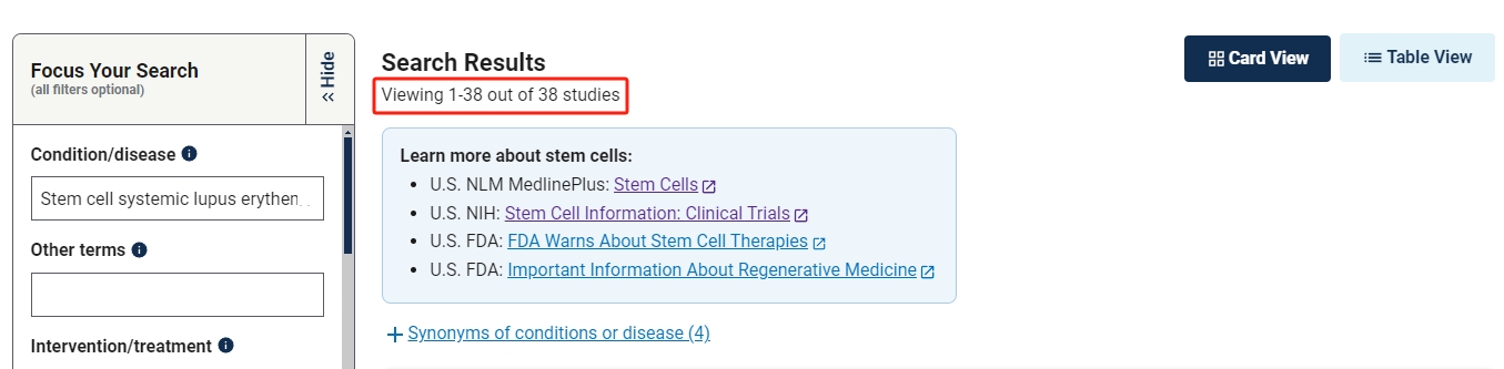 截止2024年3月,在美國國立衛生研究院的最大臨床試驗注冊庫clinicaltrials.gov網(wǎng)站上注冊的有關(guān)干細胞治療系統性紅斑狼瘡的臨床研究項目有38項。