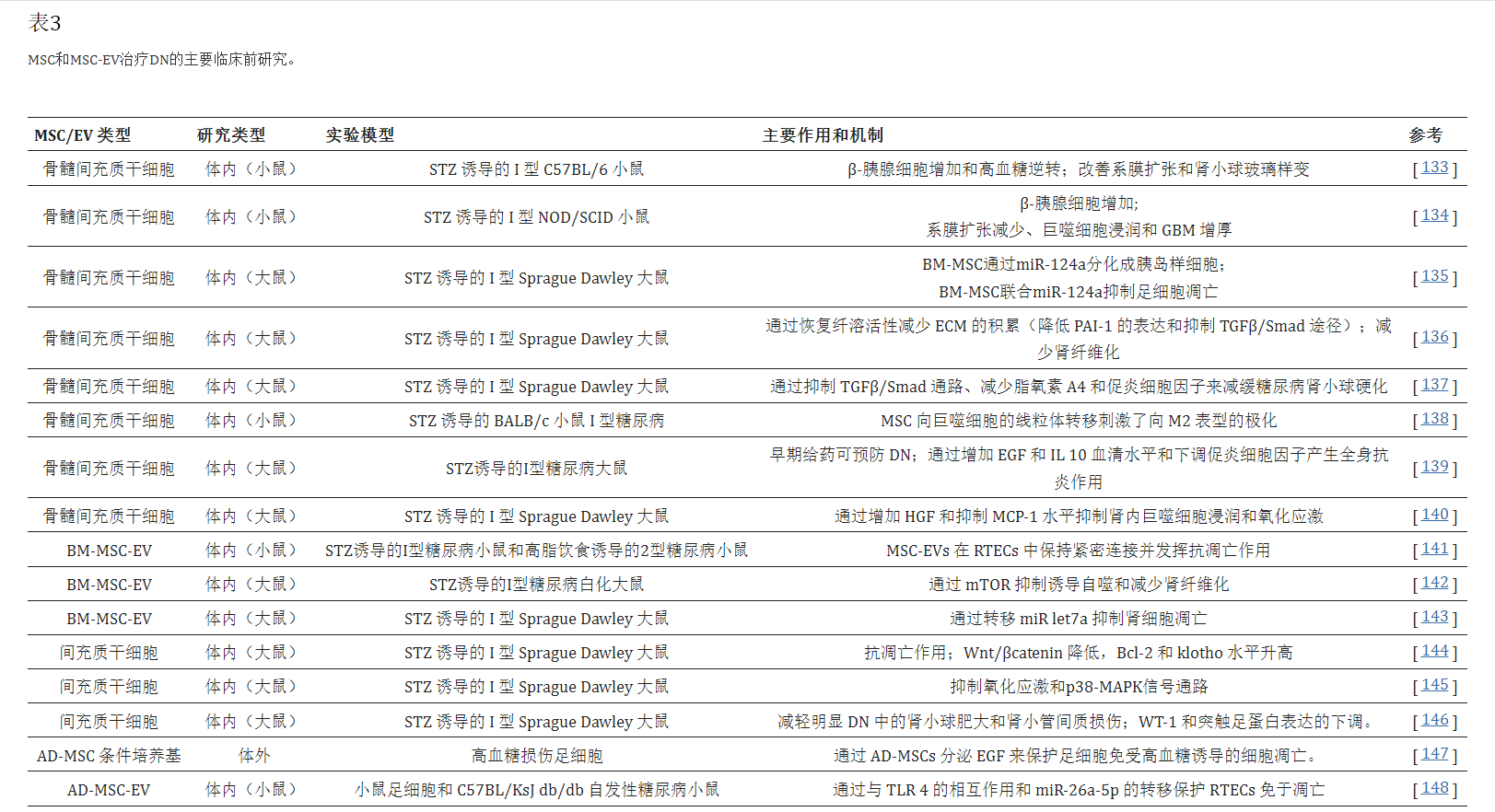糖尿病腎病是西方國家終末期腎病的主要原因之一。在過(guò)去十年中,干細胞療法已被用作糖尿病的治療,總體上取得了可喜的結果,盡管僅在臨床前模型中 (表3)。除了BM-MSC,還有幾項研究使用了其他類(lèi)型的SC,如EPC、iPSC 和尿源性SC(USC),將在以下小段中單獨分析。