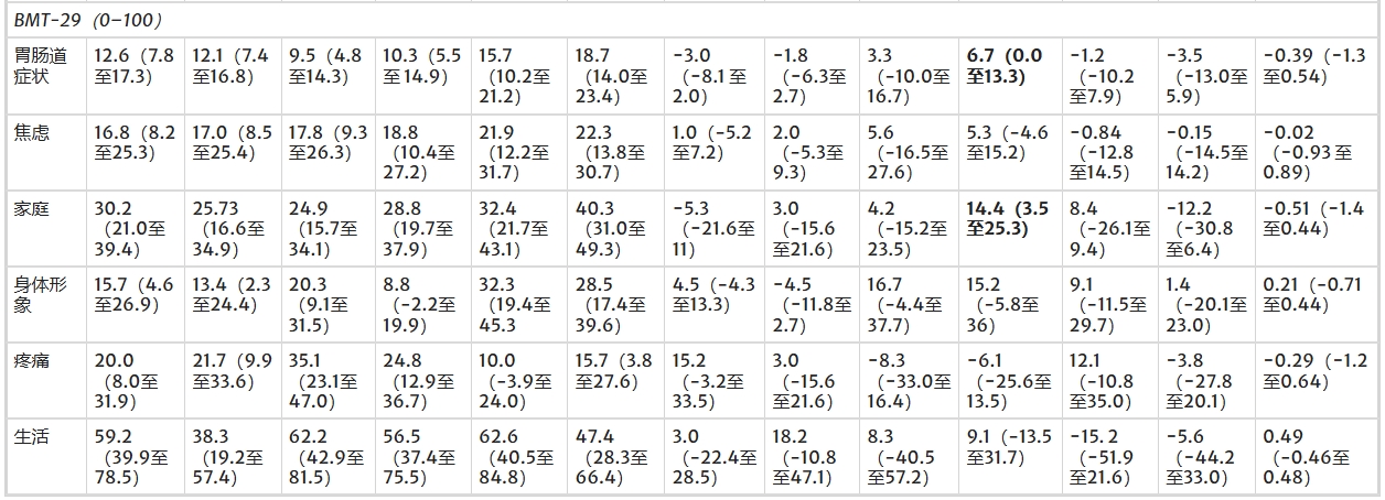 小結:在次要患者結局方面,實(shí)驗組在生活質(zhì)量的 “身體功能” 和 “角色功能” 子量表上顯著(zhù)優(yōu)于對照組,且在體重、認知、社會(huì )功能等多項指標上呈現中到大效應的改善趨勢,盡管部分指標(如呼吸困難、胃腸道癥狀)未達統計學(xué)顯著(zhù)。但實(shí)驗組在體力活動(dòng)和營(yíng)養攝入達標率上與對照組無(wú)差異,約17%的參與者存在鈣缺乏。健康服務(wù)結局顯示,兩組干細胞植入時(shí)間無(wú)顯著(zhù)差異,提示干預措施未對治療流程關(guān)鍵時(shí)間節點(diǎn)產(chǎn)生影響。