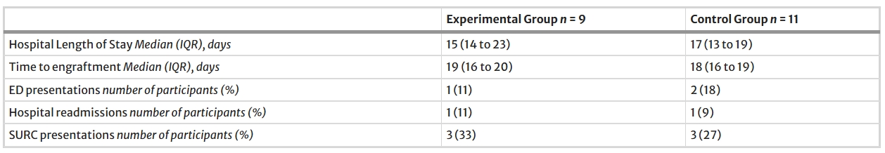 住院時(shí)間組間無(wú)差異。對照組中有兩名參與者,實(shí)驗組中有一名參與者到急診就診,每組各有一名患者在移植后3個(gè)月內再次入院(表2)。