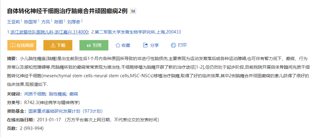 [3]:王亞莉,陳國軍,方鳳,等. 自體轉化神經(jīng)干細胞治療腦癱合并頑固癲癇2例[J]. 臨床薈萃,2012,27(11):993-994.