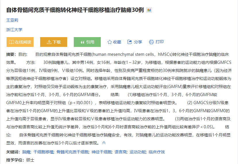 [7]:王亞莉. 自體骨髓間充質(zhì)干細胞轉化神經(jīng)干細胞移植治療腦癱30例[D]. 浙江:浙江大學(xué),2016.