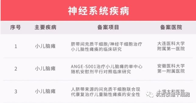 2019年,大連醫科大學(xué)附屬一院劉晶教授主持的《臍帶間充質(zhì)干細胞/神經(jīng)干細胞治療小兒腦性癱瘓的臨床研究》項目已經(jīng)通過(guò)衛計委備案并啟動(dòng)。