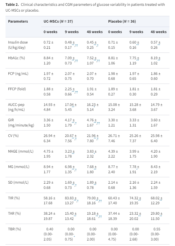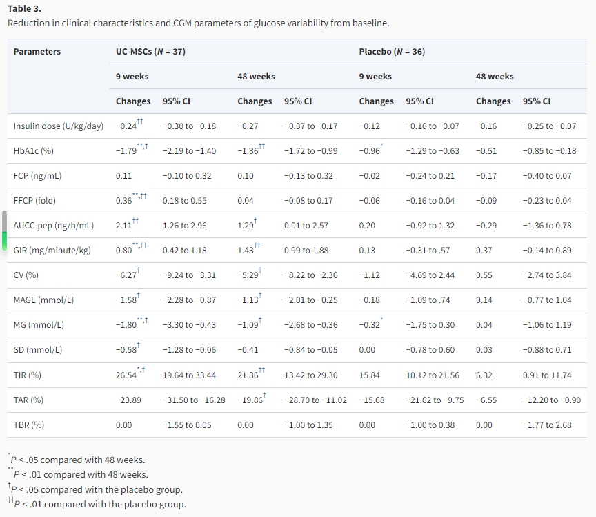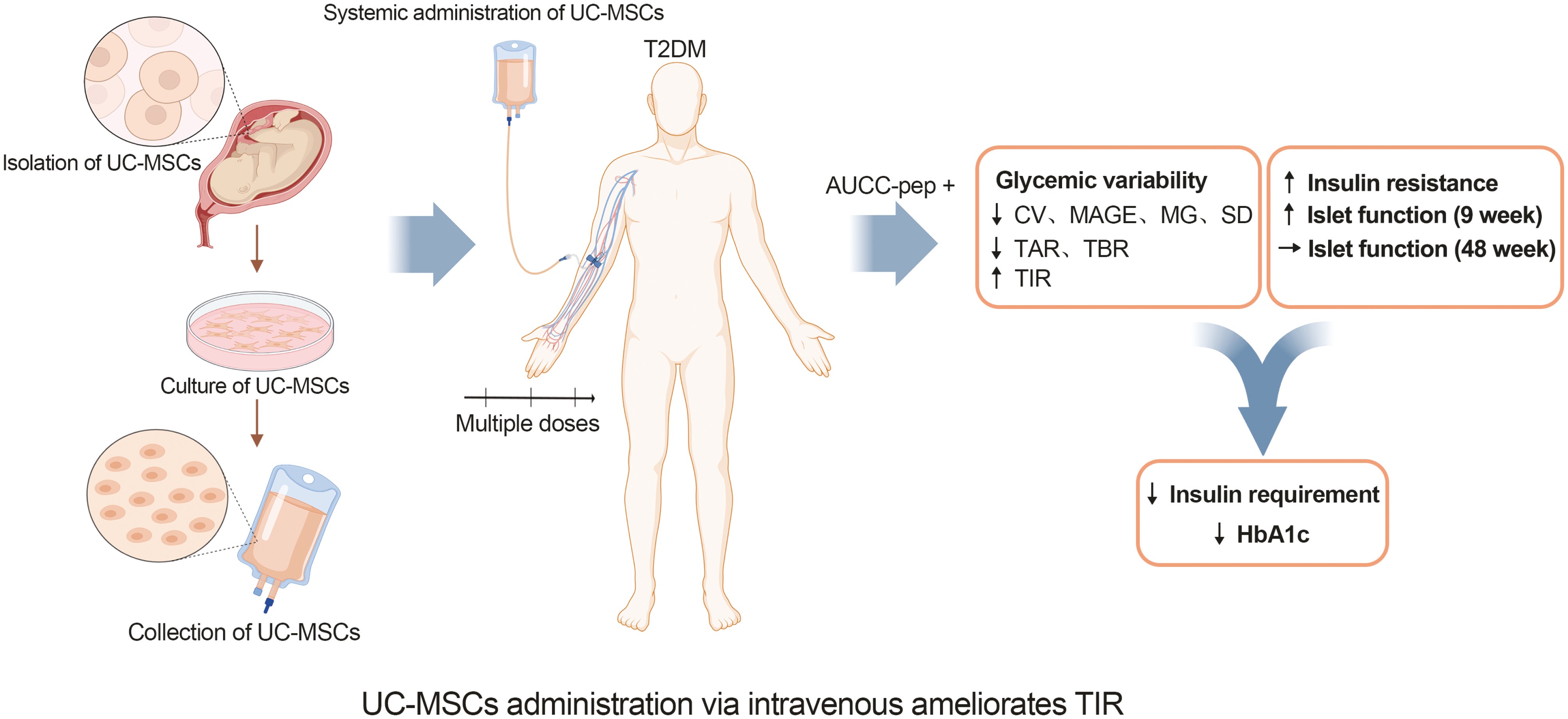 這項前瞻性、單中心、隨機、雙盲、安慰劑對照試驗證明,通過(guò)靜脈輸注臍帶間充質(zhì)干細胞可有效改善TIR和血糖變異性。