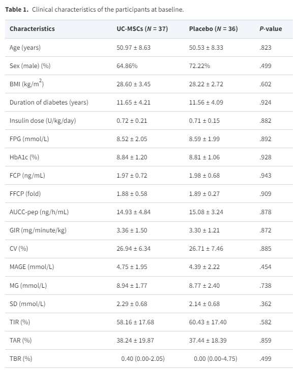 為了進(jìn)一步評估臍帶間充質(zhì)干細胞對TIR的治療效果,我國301醫院開(kāi)展了一項II期研究,通過(guò)回顧性連續血糖監測 (CGM) 評估臍帶間充質(zhì)干細胞對中國成人2型糖尿病 (T2D) 的療效。在這項隨機和安慰劑對照試驗中,共有73名患者被隨機分配接受臍帶間充質(zhì)干細胞靜脈輸注 ( n=37) 或安慰劑 ( n=36) 3次,間隔4周,隨訪(fǎng)48周。主要終點(diǎn)是TIR和糖化血紅蛋白 (HbA1c) 的變化。