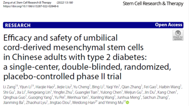 2022年5月3日,由中國人民解放軍第一醫學(xué)中心(原301醫院)內分泌科母義明教授和生物治療中心韓衛東教授領(lǐng)銜的一項單中心、隨機、雙盲對照間充質(zhì)干細胞治療2型糖尿病II期臨床研究結果公布,發(fā)表在《Stem Cells Research&Therapy》雜志上。