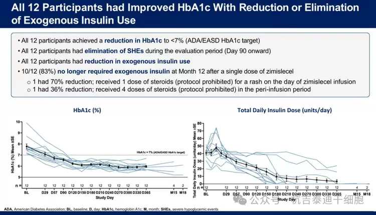 在針對嚴重1型糖尿病伴低血糖無(wú)知覺(jué)患者的試驗中,83%(10/12)的患者一年內完全停用胰島素,所有患者HbA1c降至正常(<7%)、血糖達標時(shí)間(TIR)超93%,且嚴重低血糖事件從第90天起清零,首次實(shí)現接近“功能性治愈”的療效。