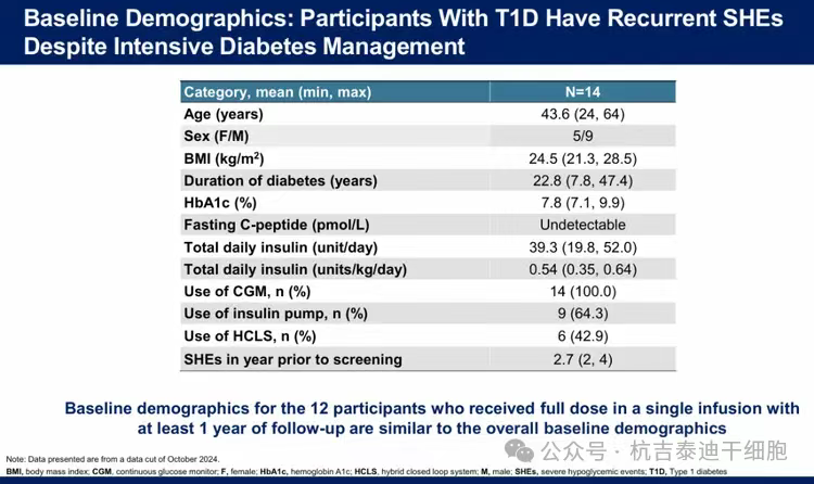 此次公布數據的I/II期研究是一項開(kāi)放標簽、單臂臨床試驗,共納入了14例低血糖感知受損(IHA)且每年至少發(fā)生兩次嚴重低血糖(SHE)事件的1型糖尿病成人患者,評估了單次輸注全劑量Zimislecel(0.8*109個(gè)細胞)后至少隨訪(fǎng)1年的療效和安全性。