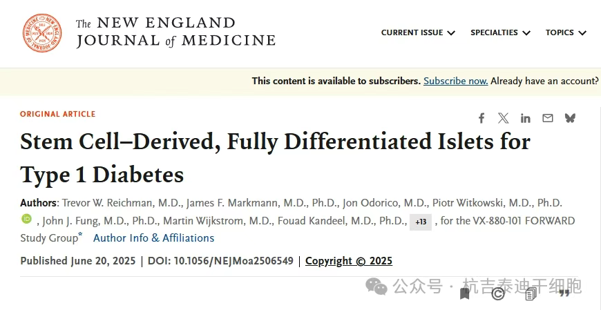 2025年6月20號《新英格蘭醫學(xué)雜志》發(fā)表了一項《干細胞衍生的完全分化胰島用于1型糖尿病》的研究結果[1]。