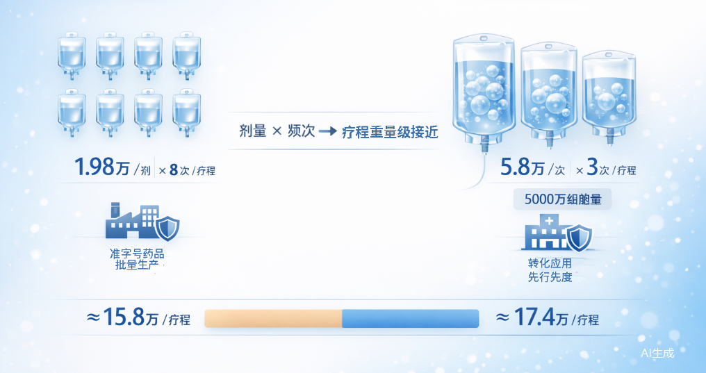 “上市藥品”與“特許技術(shù)”的區別:1.98萬(wàn)元對應的是已獲批上市、可批量生產(chǎn)的標準化藥品;5.8萬(wàn)元對應的是在先行區開(kāi)展、按個(gè)體化制備與監護的臨床轉化技術(shù),包含更精細的工藝、質(zhì)檢與醫療管理成本。