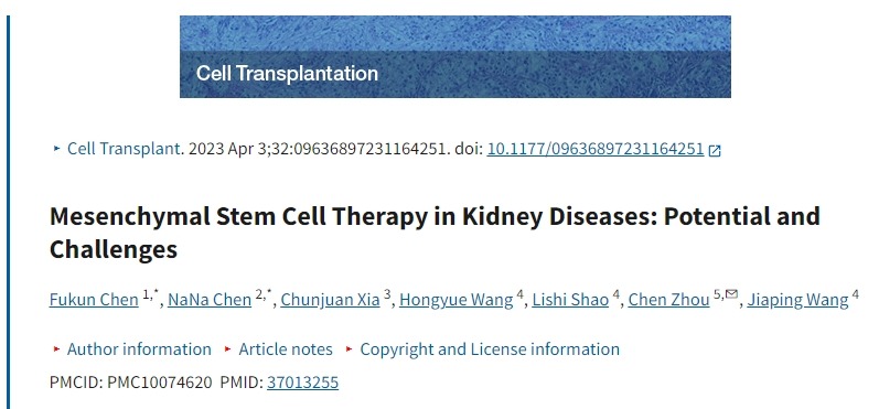 - Chen F, Chen N, Xia C, Wang H, Shao L, Zhou C, Wang J. 間充質(zhì)干細胞治療腎臟疾?。簼摿εc挑戰。細胞移植。2023 年 1 月至 12 月;32:9636897231164251。doi:10.1177/09636897231164251。PMID:37013255;PMCID:PMC10074620。