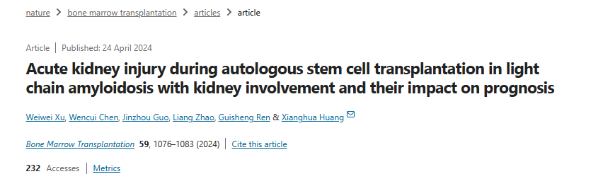 2、Xu W, Chen W, Guo J, Zhao L, Ren G, Huang X. Acute kidney injury during autologous stem cell transplantation in light chain amyloidosis with kidney involvement and their impact on prognosis. Bone Marrow Transplant. 2024 Aug;59(8):1076-1083. doi: 10.1038/s41409-024-02292-5. Epub 2024 Apr 24. PMID: 38658659.