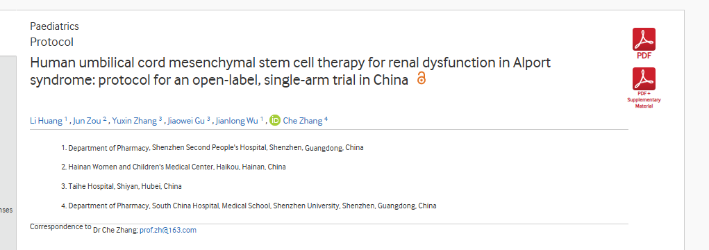 2024年3月15日,深圳二院發(fā)布了一篇《人臍帶間充質(zhì)干細胞治療 Alport 綜合征腎功能障礙:中國開(kāi)放標簽、單臂試驗方案?》的研究結果。
