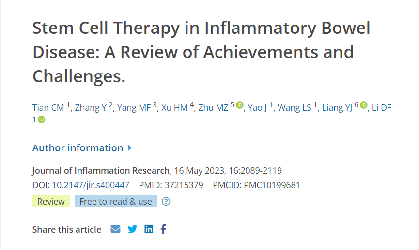 參考資料:Tian CM, Zhang Y, Yang MF, et al. Stem Cell Therapy in Inflammatory Bowel Disease: A Review of Achievements and Challenges. Journal of Inflammation Research. 2023 ;16:2089-2119. DOI: 10.2147/jir.s400447. PMID: 37215379; PMCID: PMC10199681.