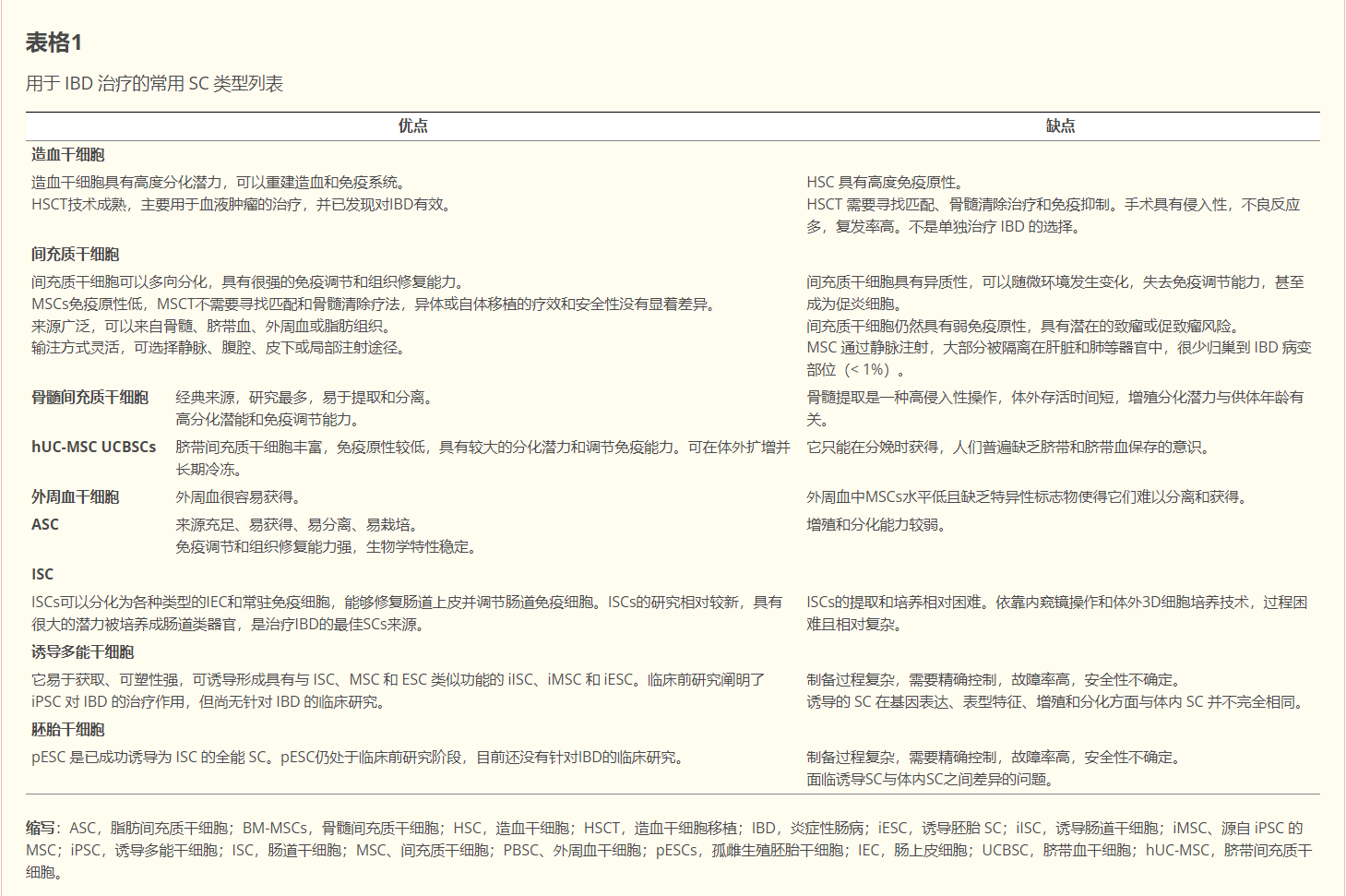各種類(lèi)型的SC,包括造血干細胞 (HSC)、MSC、ISC和誘導多能干細胞 (iPSC),已用于治療IBD。請參閱表格1查看用于IBD治療的常用SC類(lèi)型列表。
