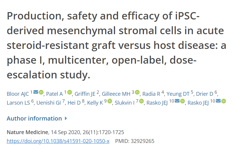4.?Bloor AJC, Patel A, Griffin JE, Gilleece MH, Radia R, Yeung DT, et al. .?Production, safety and efficacy of iPSC-derived mesenchymal stromal cells in acute steroid-resistant graft versus host disease: a phase I, multicenter, open-label, dose-escalation study.?Nat Med.?(2020)?26:1720–5. 10.1038/s41591-020-1050-x [Abstract] [CrossRef]?[Google Scholar]