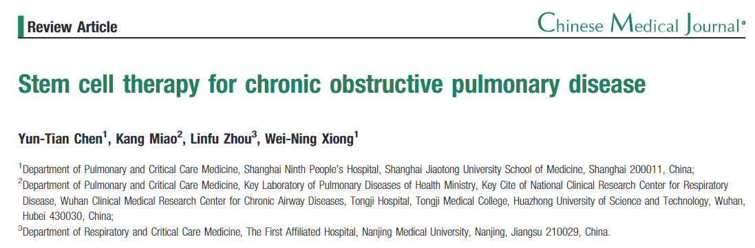 2012年7月發(fā)表在《中醫學(xué)雜志》上由上海交大九院?陳云田、?熊偉寧、同濟醫院?國家呼吸系統疾病臨床醫學(xué)研究中心、武漢市慢性氣道疾病臨床醫學(xué)研究中心苗康,?南京醫科大學(xué)第一附屬醫院周林甫,聯(lián)合發(fā)表了一項研究《干細胞治療慢性阻塞性肺疾病》綜述了歷年來(lái)。間充質(zhì)干細胞(MSCs)治療COPD已發(fā)表的臨床研究的結果,分析了不同種類(lèi)的干細胞、不同的細胞來(lái)源、不同的給藥方式和劑量來(lái)治療COPD的結果 。結論為安全并且表現正面的效果。