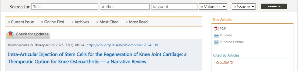 主要參考資料:Lee HJ, Hossain R, Baek CH, Lee CJ, Hwang SC. Intra-Articular Injection of Stem Cells for the Regeneration of Knee Joint Cartilage: a Therapeutic Option for Knee Osteoarthritis – a Narrative Review. Biomolecules & Therapeutics. 2025 Jan;33(1):86-94. DOI: 10.4062/biomolther.2024.139. PMID: 39632656; PMCID: PMC11704397.