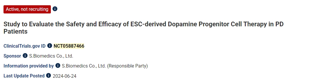 該項臨床試驗(NCT05887466)是一項開(kāi)放標簽、單中心、單劑量、劑量遞增、I/IIa期試驗,旨在評估胚胎干細胞衍生的A9多巴胺祖細胞(A9-DPC)治療PD患者的安全性和探索性療效,該試驗由S.Biomedics贊助。這項研究基于Dong-Wook實(shí)驗室進(jìn)行的臨床前工作。