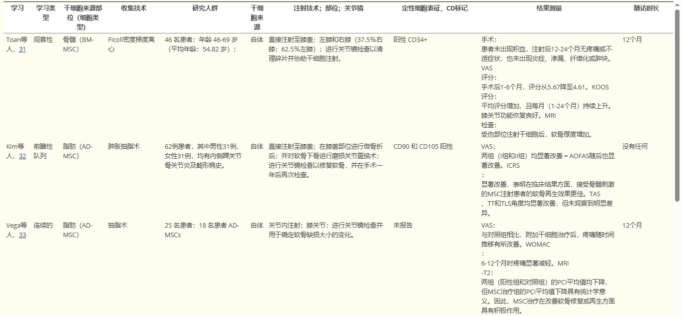 所有納入研究均聚焦于膝骨關(guān)節炎(OA)患者,他們接受了主要通過(guò)關(guān)節內注射的間充質(zhì)干細胞(MSCs) 治療(部分研究聯(lián)合關(guān)節鏡),旨在改善膝關(guān)節損傷狀況;