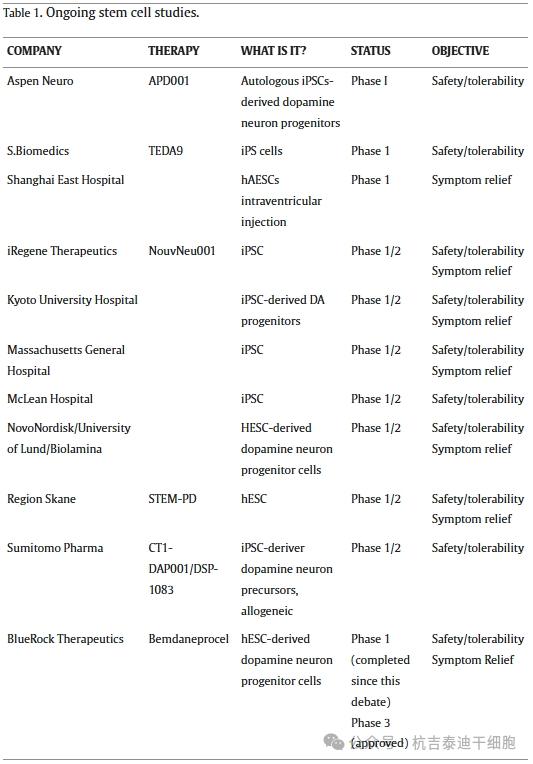 表1:正在進(jìn)行的干細胞治療帕金森病的研究