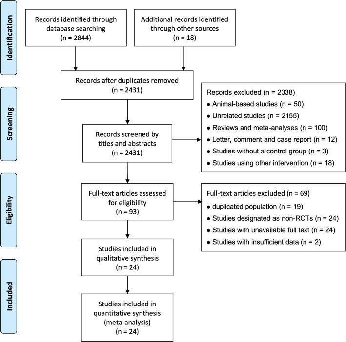我們通過(guò)搜索四個(gè)數據庫以及檢索到的文章和相關(guān)評論的參考文獻列表,共確定了2862篇可能符合條件的文章,其中431篇因重復而被排除。經(jīng)過(guò)標題和摘要審查,進(jìn)一步排除了2338篇文章,剩下93篇可能相關(guān)的文章。在對全文進(jìn)行詳細評估后,進(jìn)一步排除了69篇論文。最后,24項研究被納入本薈萃分析。研究選擇流程圖見(jiàn)圖1。