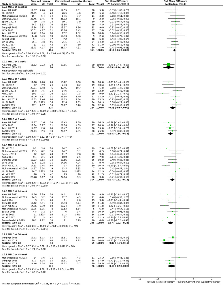 MELD評分分析中包括15項研究(3098名受試者)(圖4)。治療前,實(shí)驗組和對照組之間未觀(guān)察到顯著(zhù)差異(SMD=?0.14,95%CI?0.28至0.00;P=0.06)。治療后,干細胞療法與第2周(SMD=?0.79,95%CI? 1.44至?0.15;P=0.02)、第8周(SMD=?0.58,95%CI?0.84至?0.32;P<0.0001),第12周(SMD=?0.37,95%CI?0.62至?0.12;P=0.003)和第24周(SMD=?0.57,95%CI?0.92至?0.23;P=0.001)。