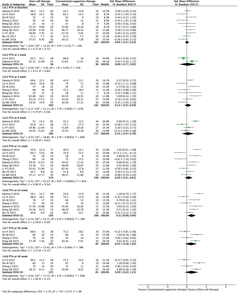19項研究(4708名受試者)被納入TBIL水平的分析(圖5)。治療前,實(shí)驗組和對照組之間未觀(guān)察到顯著(zhù)差異(SMD=?0.04,95%CI?0.17至0.09;P=0.53)。治療后,干細胞治療與第4周(SMD=?0.31,95%CI? 0.58至?0.05;P=0.02)、第12周(SMD=?0.43,95%CI?0.70至?0.17;P=0.001),第24周(SMD=?0.40,95%CI?0.75至?0.05;P=0.02)和第48周(SMD=?0.29,95%CI ? 0.51至?0.06;P= 0.01)。